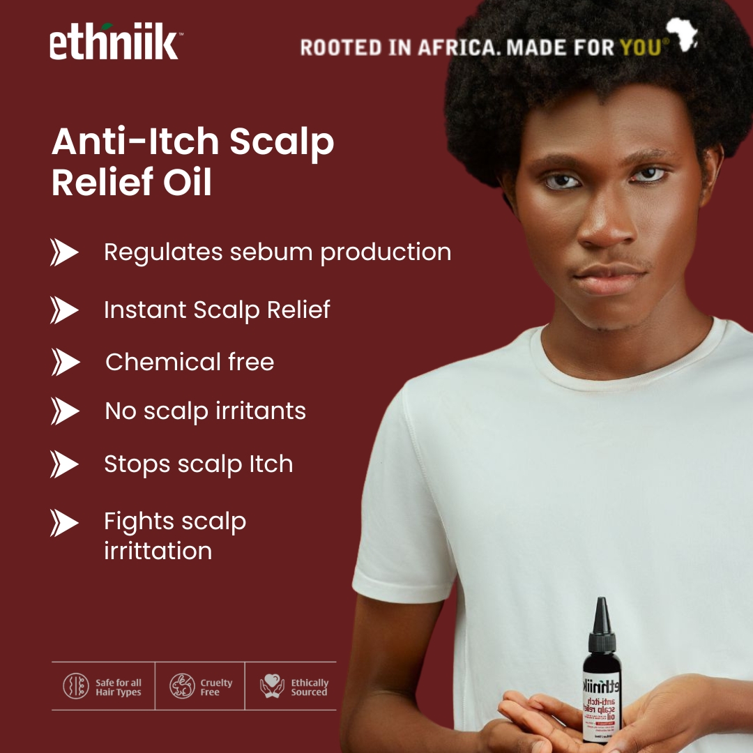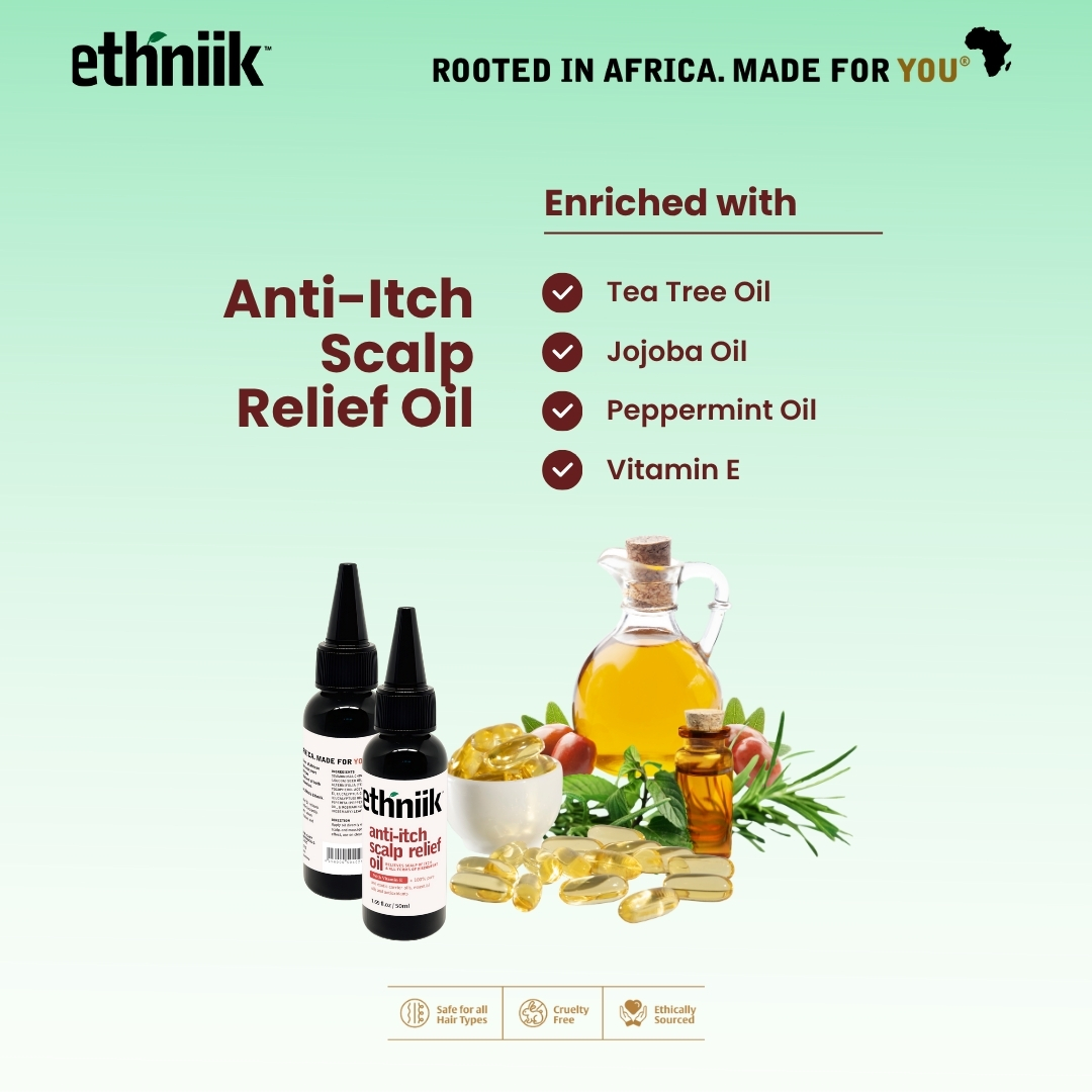 Ethniik Anti-Itch Scalp Relief Oil relieves the scalp of itch and discomfort instantly. It gets rid of flakes, regulates sebum production, fights scalp irritation, and soothes skin and scalp